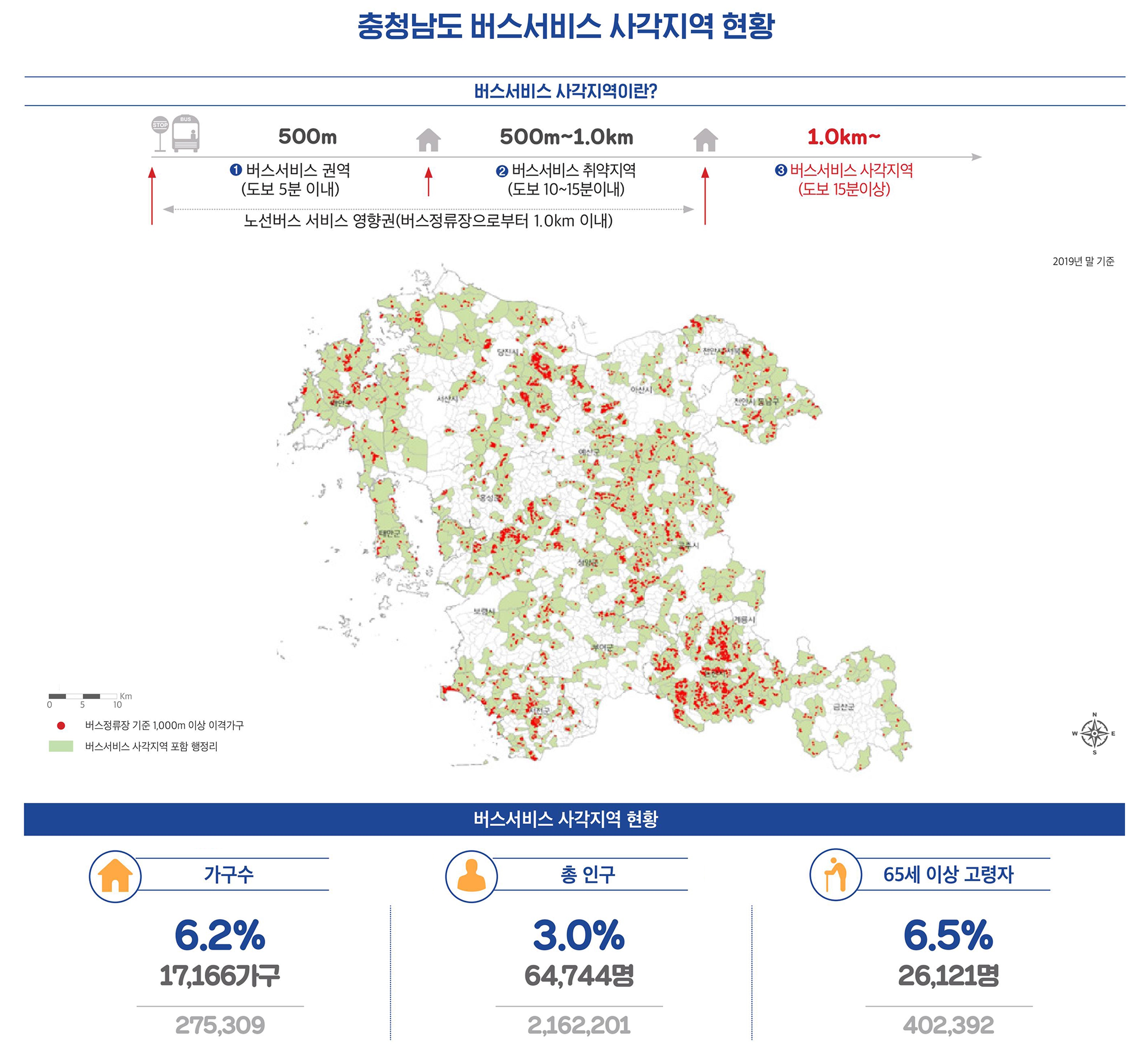 현재 충남에서 버스서비스 사각지역 현황을 보면, 가구수로는 17,166가구(6.2%)가 해당되며, 인구수로는 64,744(3.0%)이다. 65세 이상 고령자는 26,121(6.5%)으로 나타났다.