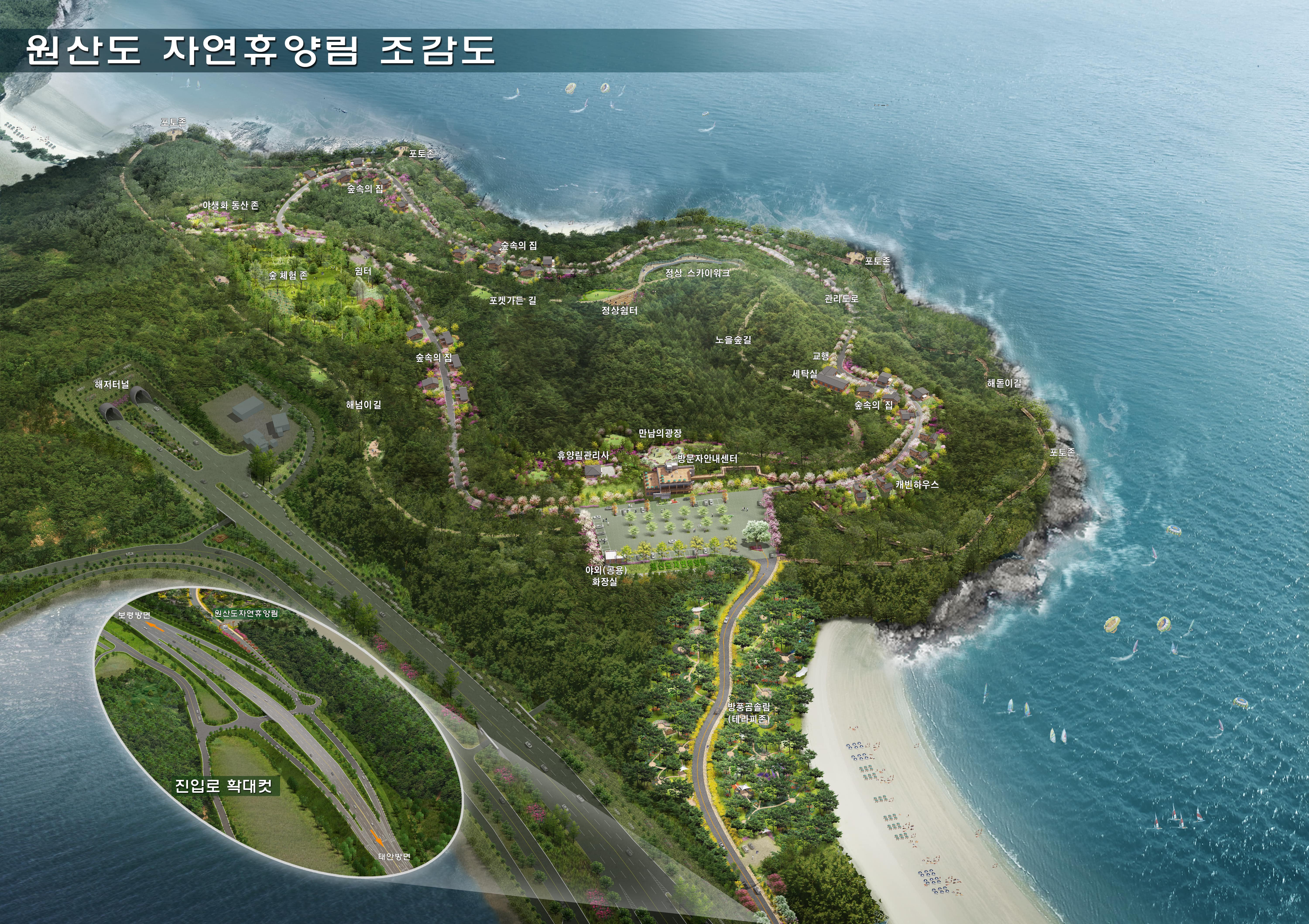 오천면 원산도리 일원에 조성되는 원산도휴양림은 다양한 산림휴양서비스 수요와 이용객의 지속 증가에 따른 산림·해양 복합형의 특색 있는 휴양림으로 조성될 예정이다.