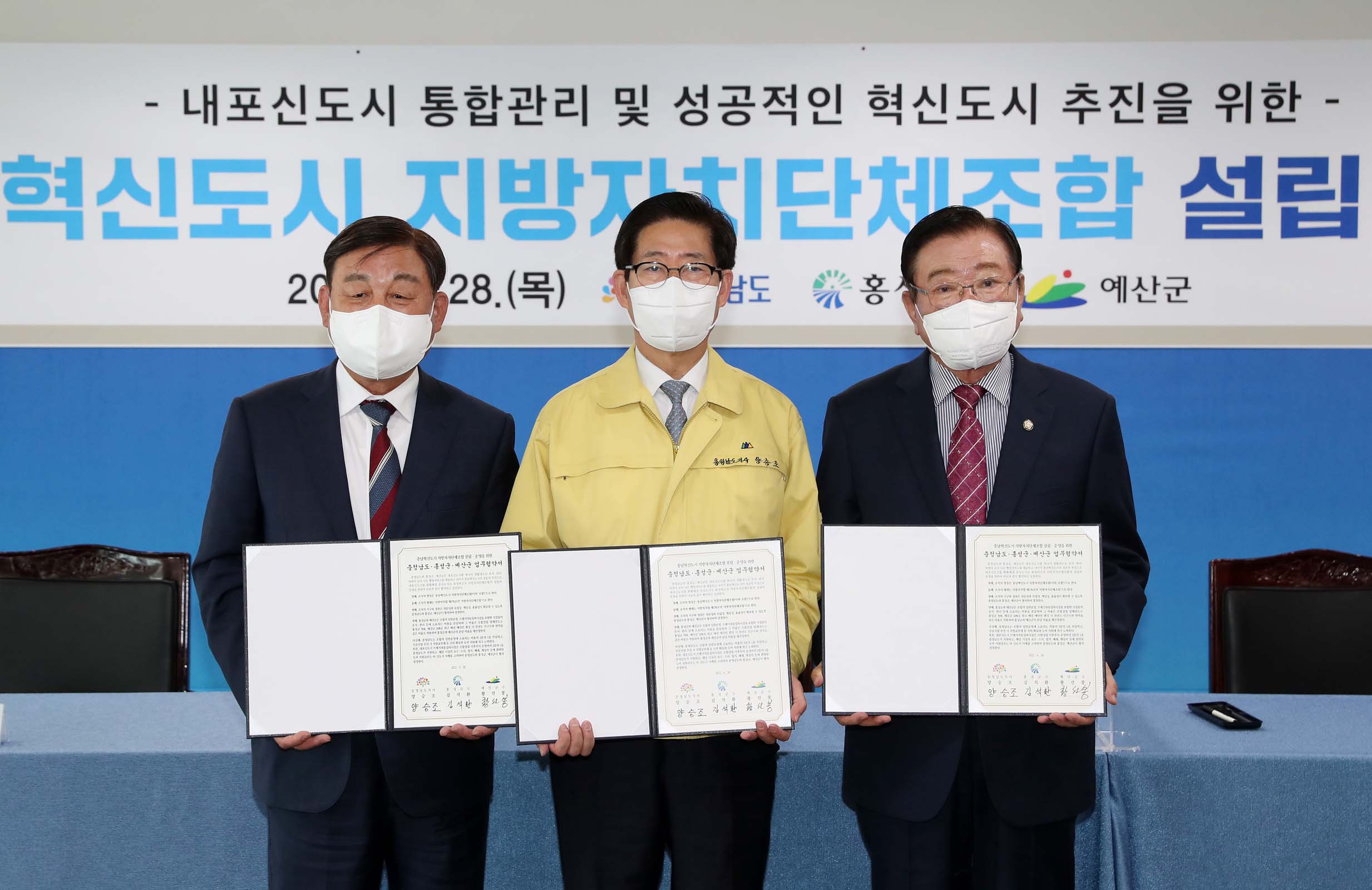 양승조 지사는 28일 도청 상황실에서 김석환 홍성군수, 황선봉 예산군수와 ‘충남혁신도시 지방자치단체조합(이하 충남지자체조합) 설립‧운영을 위한 업무협약’을 체결했다.