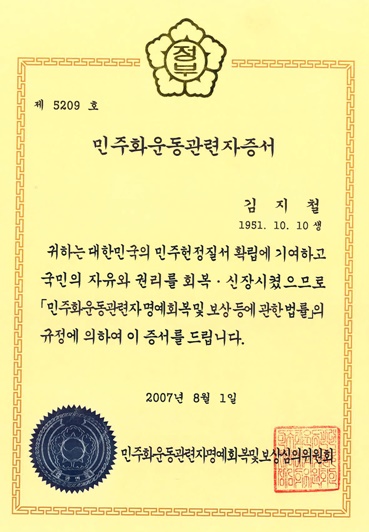 이를 증명하듯 2007년 8월, 정부로부터 받은 ‘민주화운동관련자증서’(5209호)를 공개했다. 증서에는 ‘대한민국의 민주헌정 질서 확립에 기여하고 국민의 자유와 권리를 회복·신장시켰다’라고 쓰여있다.