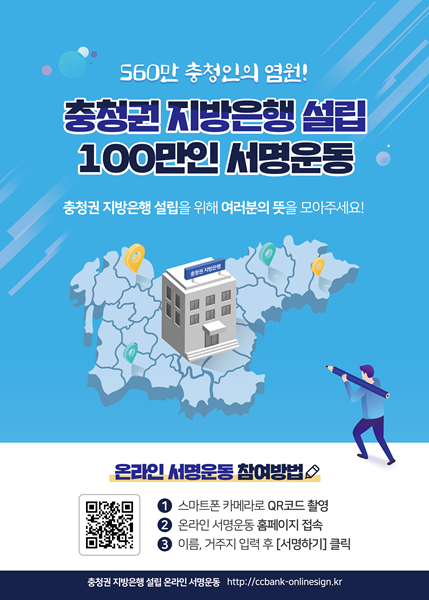 송무경 도 경제소상공과장은 “지역경제의 버팀목 역할을 할 충청권 지방은행을 성공적으로 설립해 지역경제를 활성화하고 금융 양극화를 해소할 것이다”며 “충청권 지방은행 설립에 공감하는 누구나 편리하게 서명운동에 참여할 수 있도록 온라인 창구를 마련한 만큼 많은 관심과 참여를 부탁드린다”고 말했다.