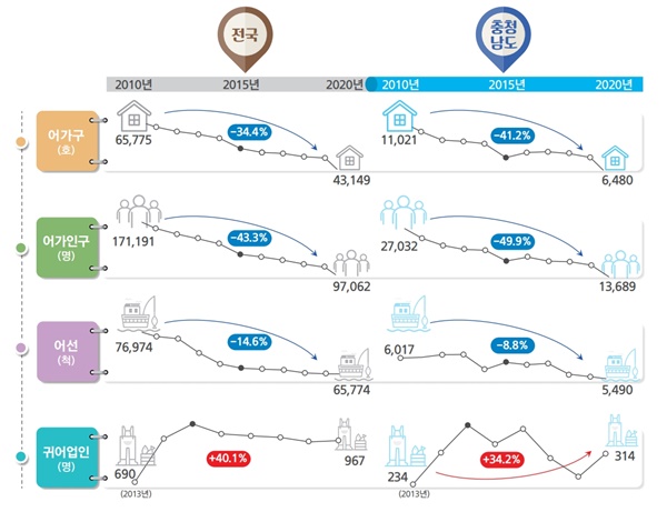 2020년 기준 충남도 어가 고령비는 평균 45.2%로, 이는 전국 어가 고령비 평균(36.0%)보다 9.2% 높다.
