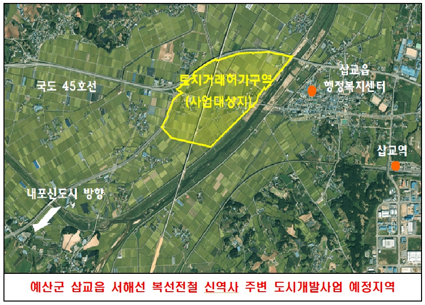 예산군 삽교읍 서해선 신역사 주변 도시개발사업 예정지역이 토지거래허가구역으로 지정됐다.