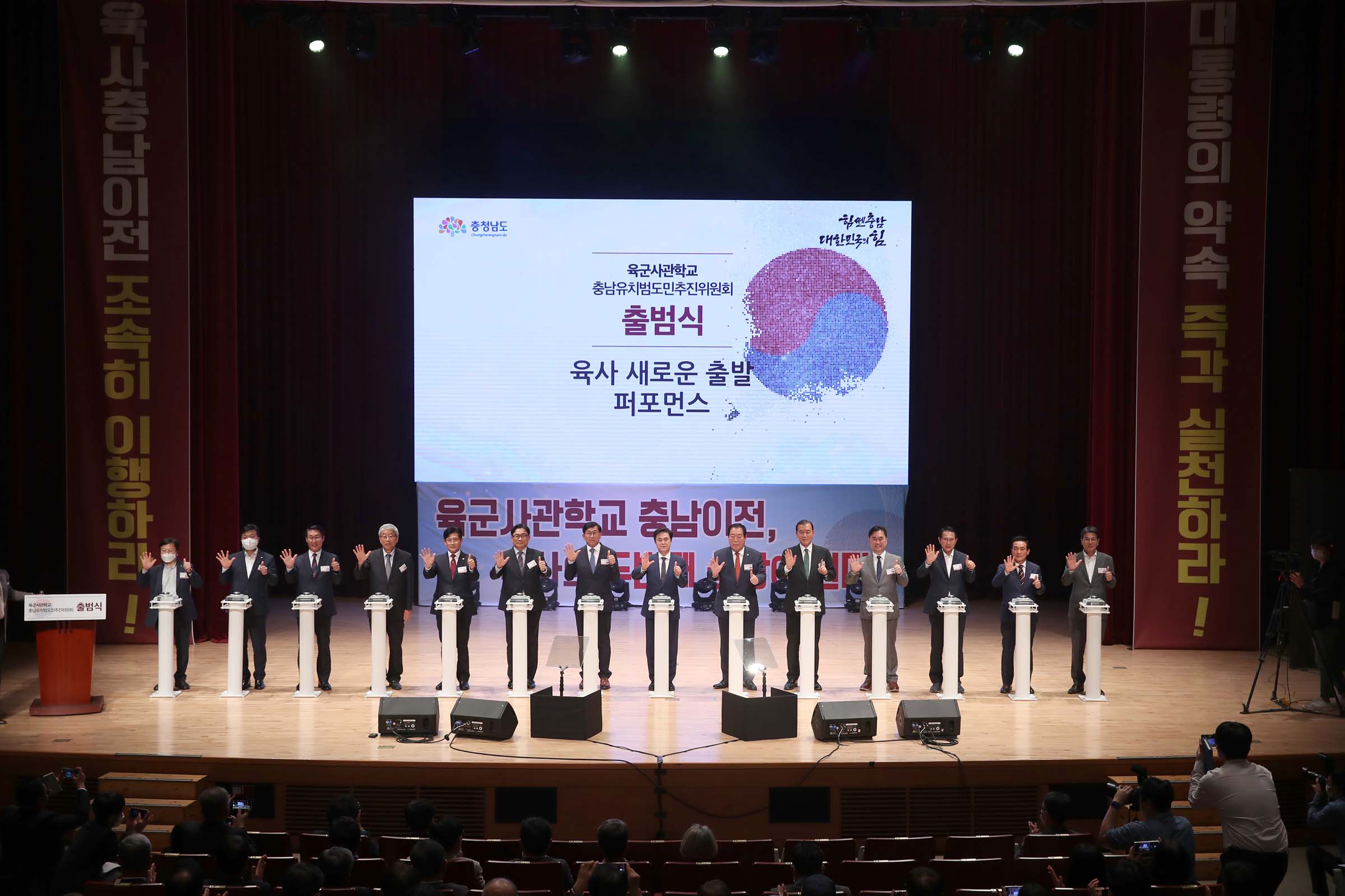 이날 출범식에는 김태흠 지사와 조길연 도의회 의장, 홍문표‧김종민 의원, 상임위원장과 공동위원장, 김용찬 충남도립대 총장 등 도내 대학 총장 12명, 백성현 논산시장을 비롯한 시장군수 5명 등 총 1000여명이 참석해 육사 충남 유치 의지를 드러냈다.