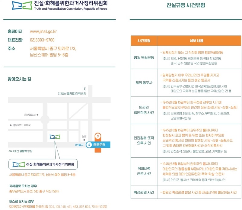 과거사 진실규명 신청은 거주지 시·군청 및 진실화해위원회(서울특별시 중구 퇴계로 173, 남산스퀘어빌딩)를 방문해 접수하거나 신청서 작성 후 우편으로도 접수할 수 있다.