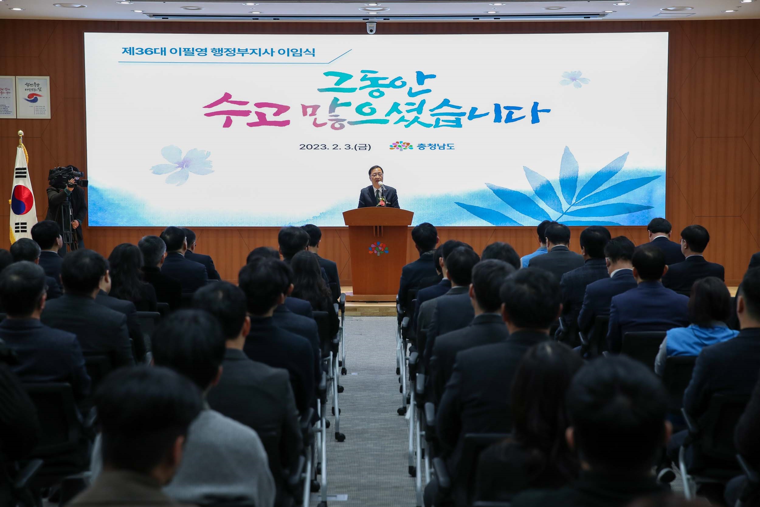 김태흠 지사와 도 실·국·원장 및 직원 등 100여 명이 참석한 가운데 연 이번 행사는 공적 소개, 영상 시청, 충청남도공무원노동조합위원장의 감사패 수여, 전별사, 이임사 등의 순으로 진행됐다.