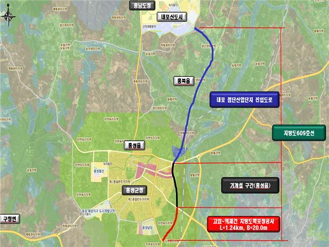 공사 구간은 홍성군 홍성읍 고암리 일대로, 장항선 폐철도부지를 활용해 회전교차로 3곳을 포함한 왕복 4차선 1.24㎞이며, 2년 내 개통을 목표로 총사업비 110억 원을 투입한다.