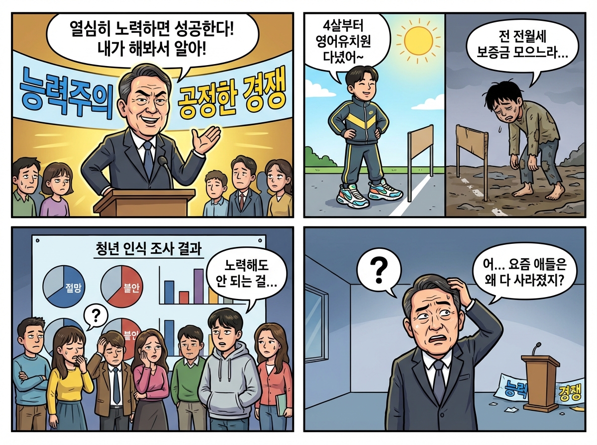 4. 풍자 각도: "공정한 경쟁"이라는 사회 시스템이 실은 이미 출발선부터 불공정한 현실