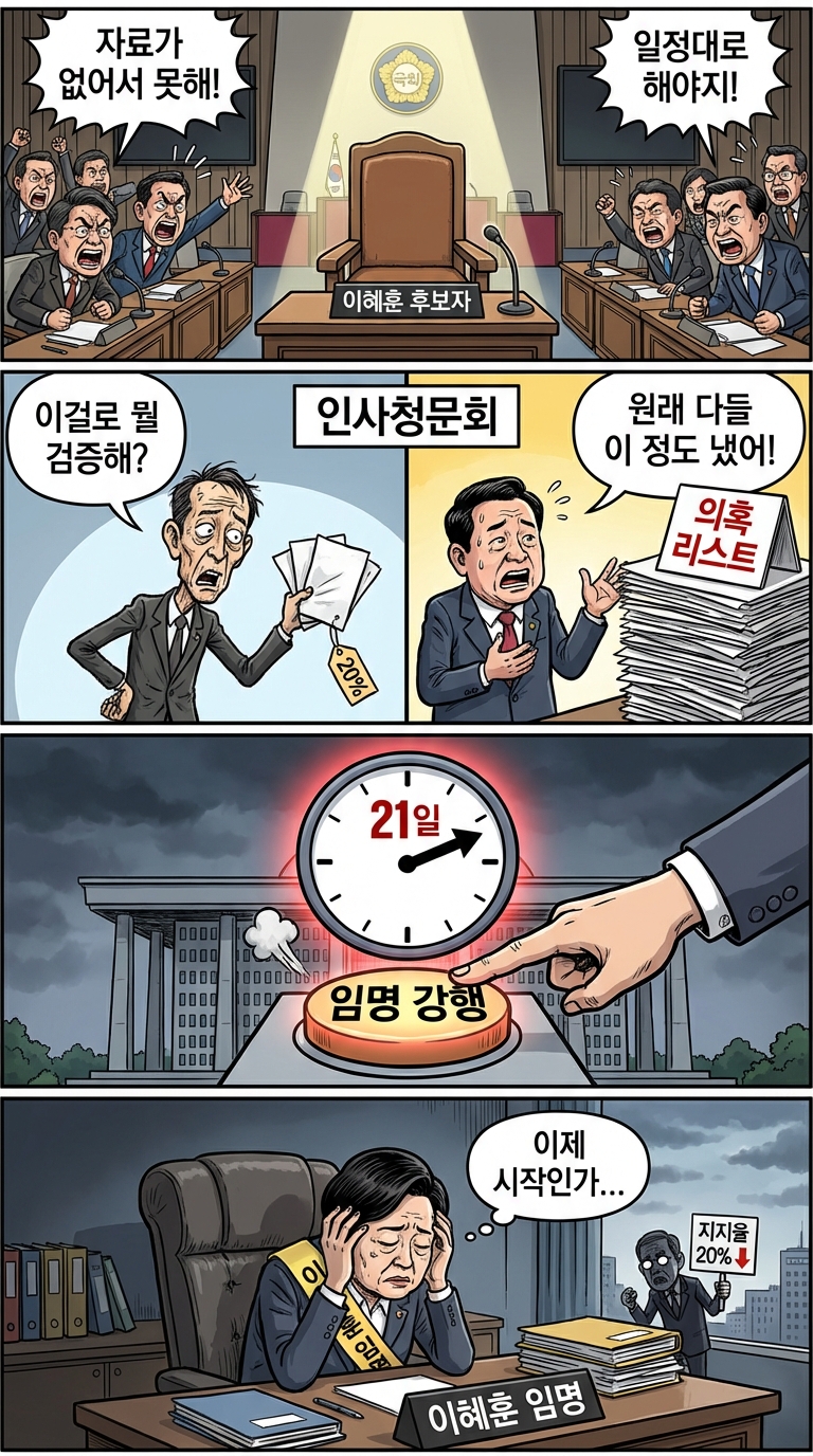 청문회가 권력 검증이 아닌, 정치 공방과 시간 때우기를 거쳐 결국 임명으로 끝나는 '통과의례'로 전락한 현실에 대한 날카로운 풍자입니다. 이는 이혜훈 후보자만의 문제가 아니라, 대한민국 인사청문회 제도 전체의 구조적 문제를 지적하고 있습니다.