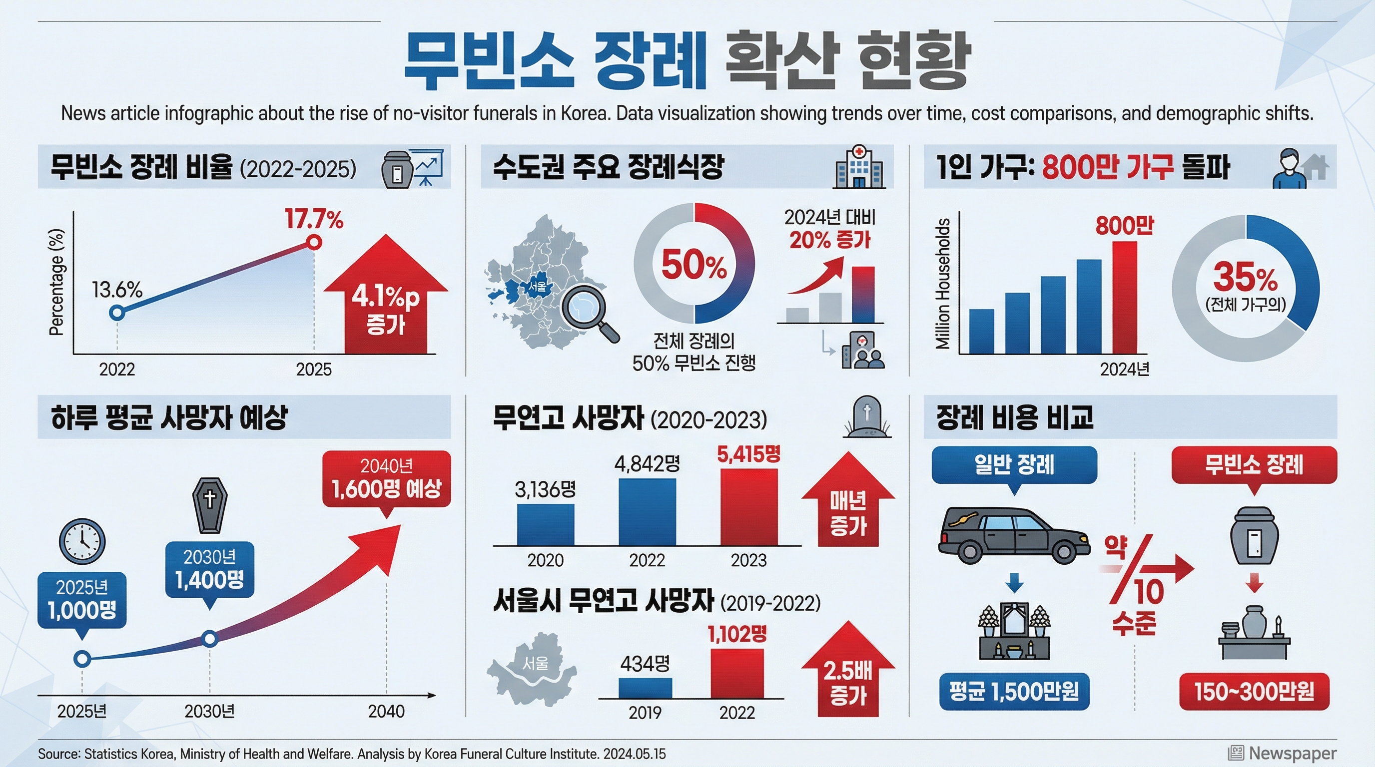전문가들은 무빈소 장례 확산의 배경으로 급격한 사회구조 변화를 꼽는다. 통계청에 따르면 2026년 현재 1인 가구는 전체 가구의 약 35%인 800만을 넘어섰다. 핵가족화와 고령화로 인해 조문을 받을 친인척과 지인이 줄어든 것이다.
