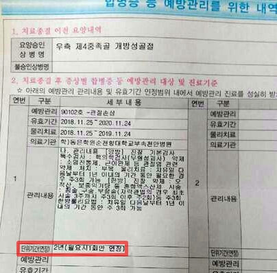 내용을 요약하면 요양승인상병명은 우측 제4중족골 개방성골절. 유효기간 2018. 11. 25~2020. 11. 24. 단위기간(연장) 2년(필요시 1회만 연장)
