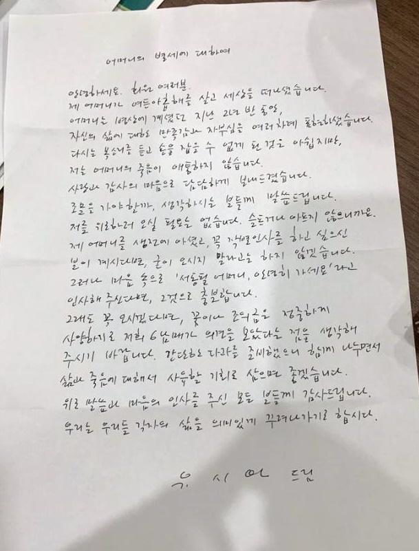 유 이사장은 "사랑과 감사의 마음으로 담담하게 보내드렸다"며 "서동필 어머니, 안녕히 가세요’라고 인사해 주신다면 그것으로 충분하다"고 비통한 심정을 표했다.