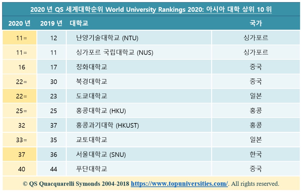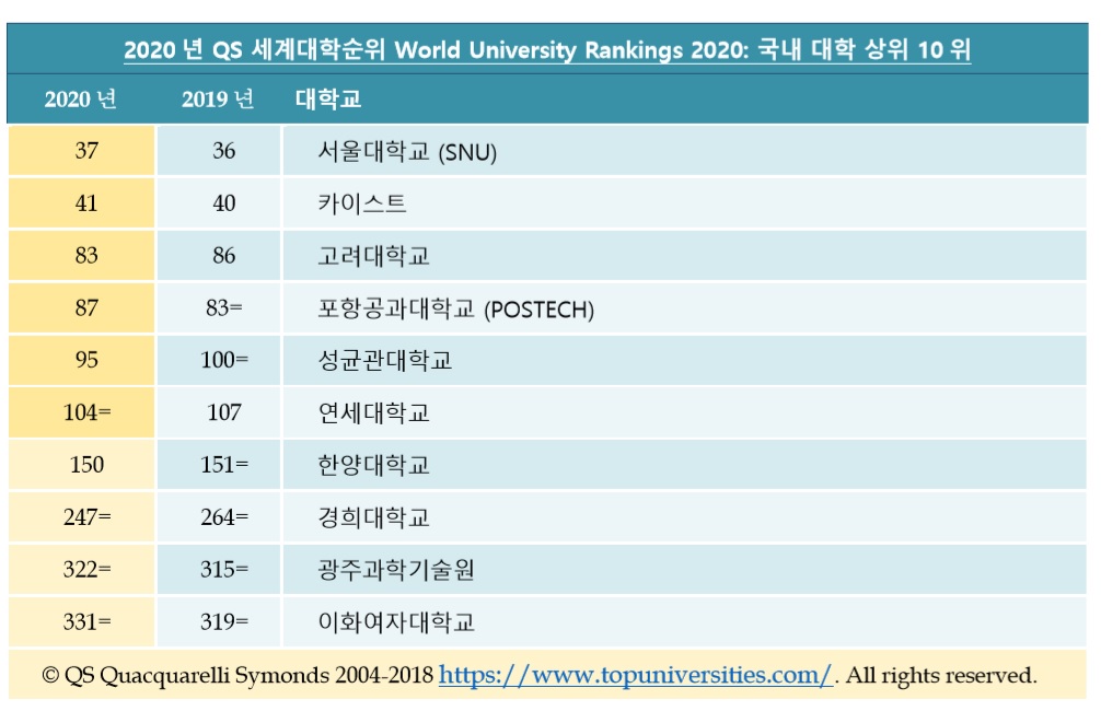 고등교육 평가기관으로 널리 알려진 영국의 세계대학평가기관 QS가 2020년 세계대학순위를 발표한 가운데 서울대가 37위, 한국과학기술원(KAIST)이 41위에 올랐다. 두 곳 모두 지난해 발표 때보다 순위가 각각 한 단계씩 내려갔다.