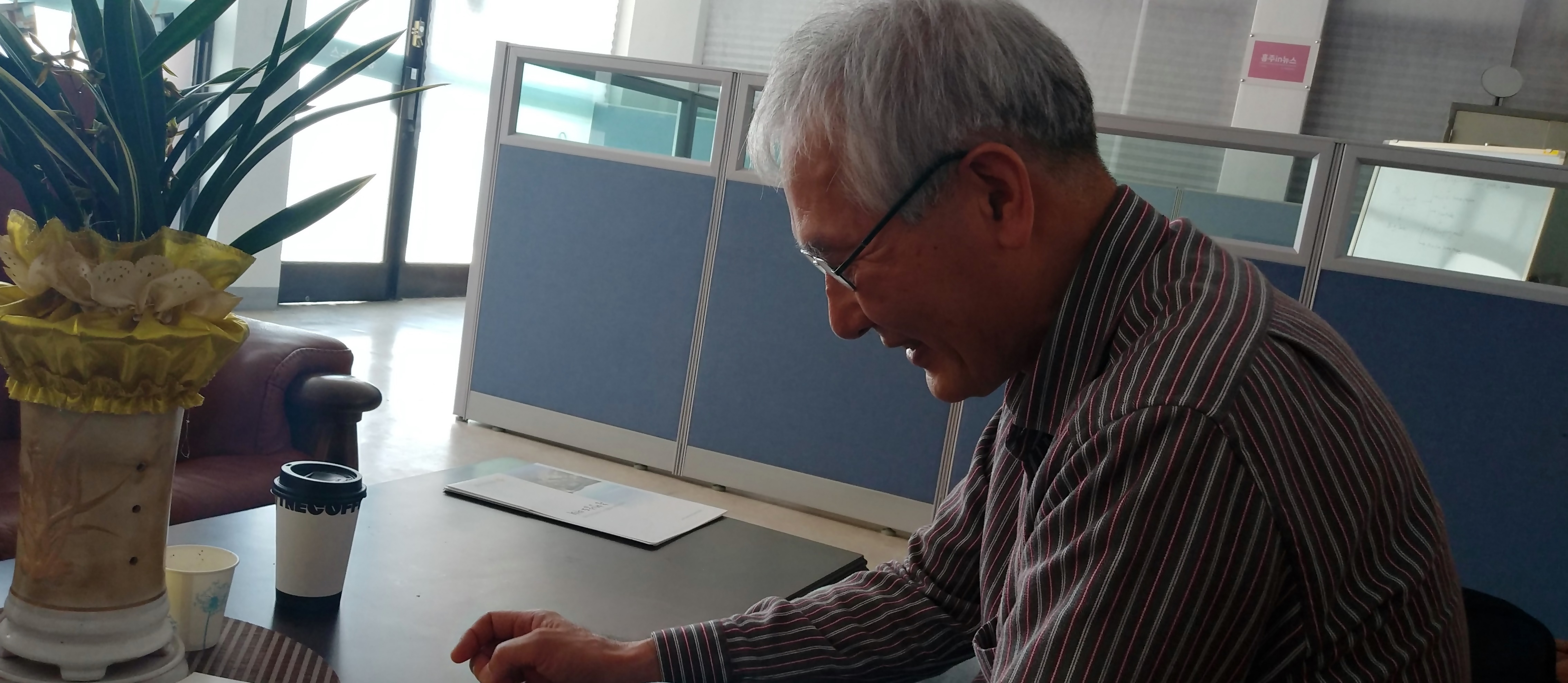 25일 충남도서관 다목적실에서 내포문화진흥포럼 준비위원회 회의를 마치고 나온 탓인지 약간은 상기된 모습이다.