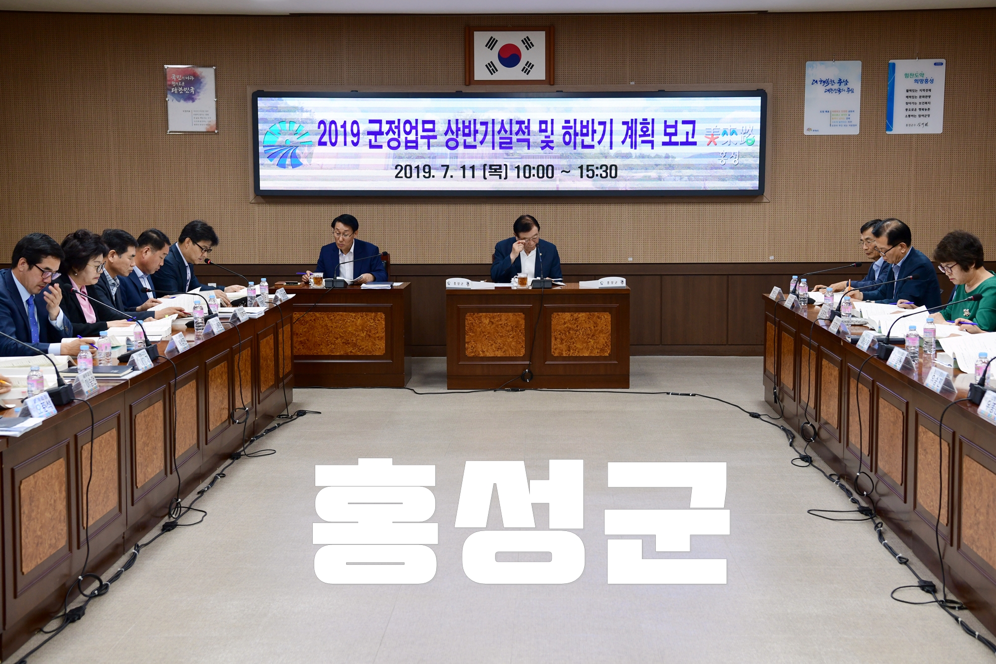 홍성군이 11일 군청 회의실에서 민선7기 1주년을 맞아 김석환 홍성군수와 이용록 부군수를 비롯한 각 담당관·과장, 직속기관·사업소장 등이 참석한 가운데 2019 군정업무 상반기 실적 및 하반기 계획 보고회를 개최했다.