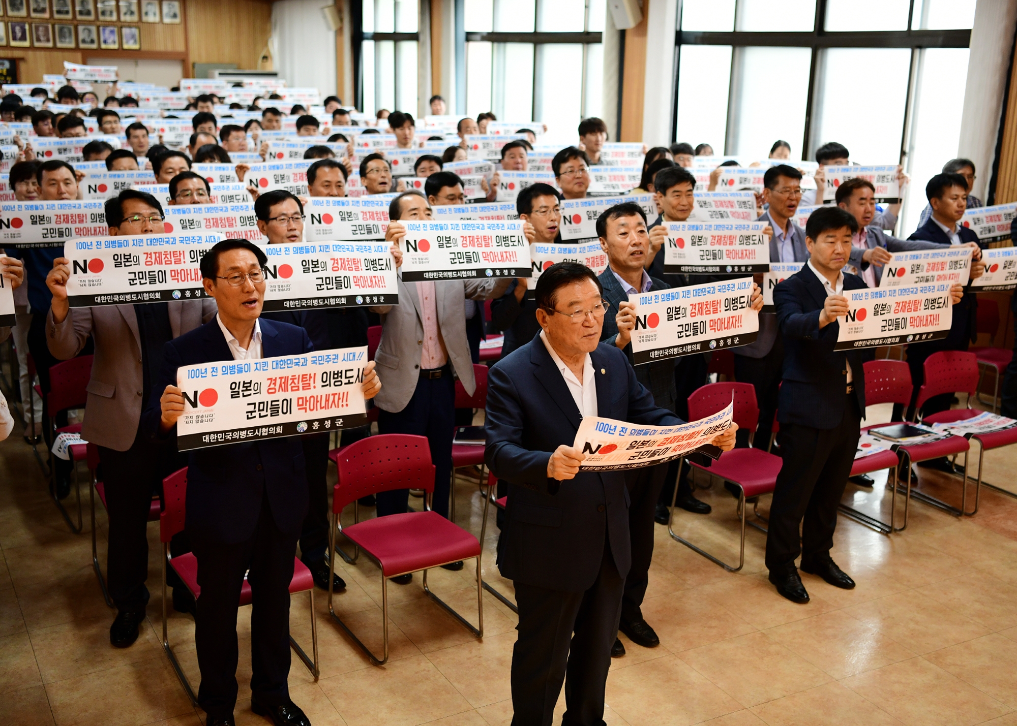 김석환 홍성군수가 1일 오전 9시 군청 대강당에서 직원 200여 명이 참석한 가운데 일본의 경제침탈 규탄대회를 개최하고, 부당한 수출규제 조치를 즉각 철회할 것을 요구했다.