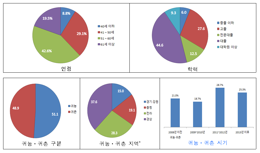 주요특성으로 조사 대상 귀농․귀촌인들은 기존 농업인들보다 상대적으로 젊고, 다양한 분야에서 학위나 자격증을 보유하고 있었다.