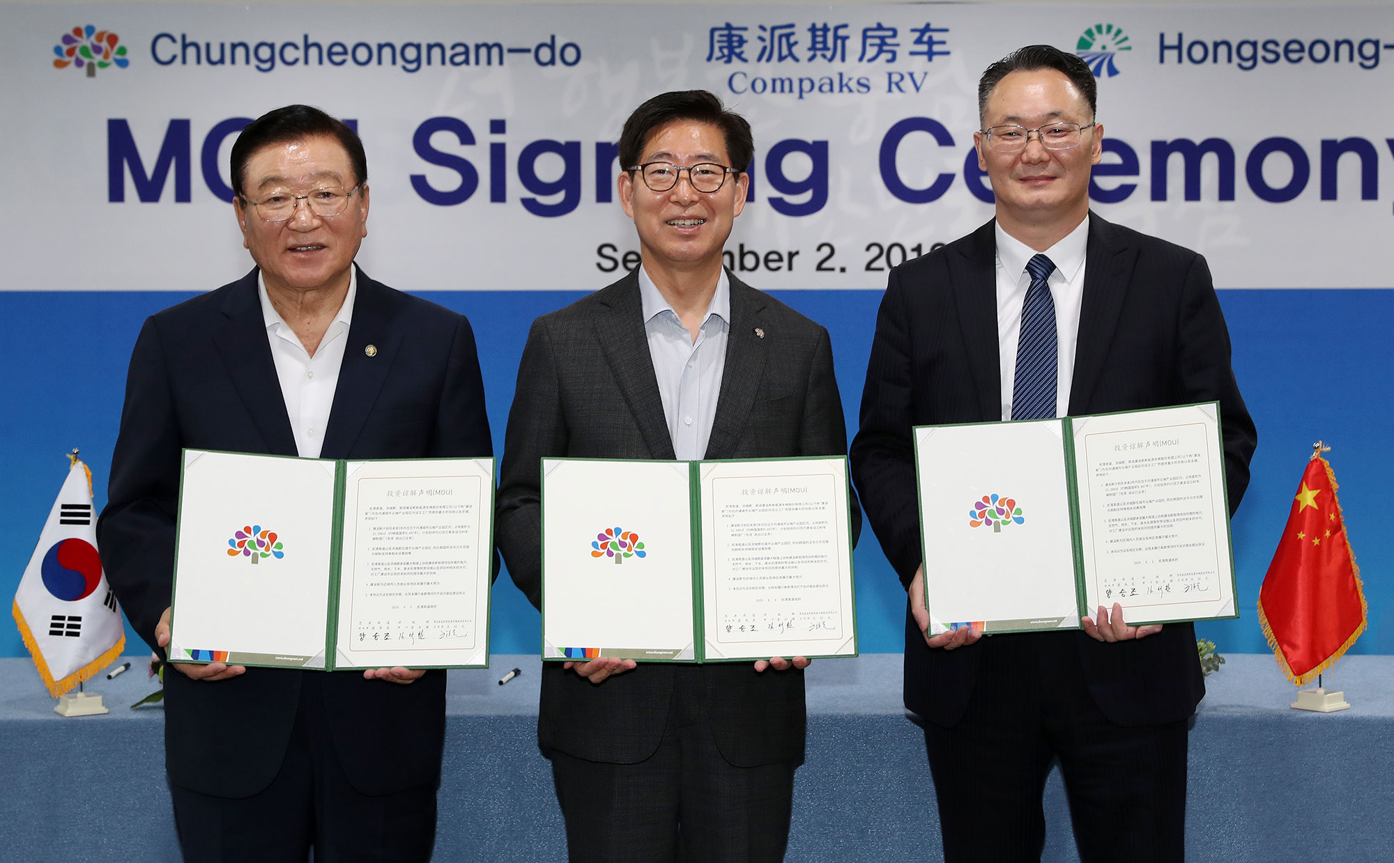 양승조 충남지사는 2일 도청에서 왕웨이위안(Wang WeiYuan) 컴팩스알브이(Compaks RV) 대표이사, 김석환 홍성군수와 투자협약(MOU)을 체결했다.