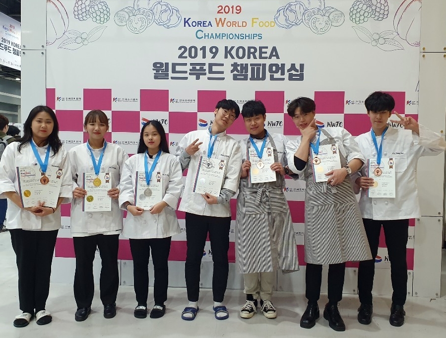 지난 1일과 2일 이틀간 서울 양재 AT센터에서 열린 ‘월드푸드‧베버리지 챔피언십’에서 호텔조리제빵학과 학생들이 금‧은‧동을 휩쓴 것.
