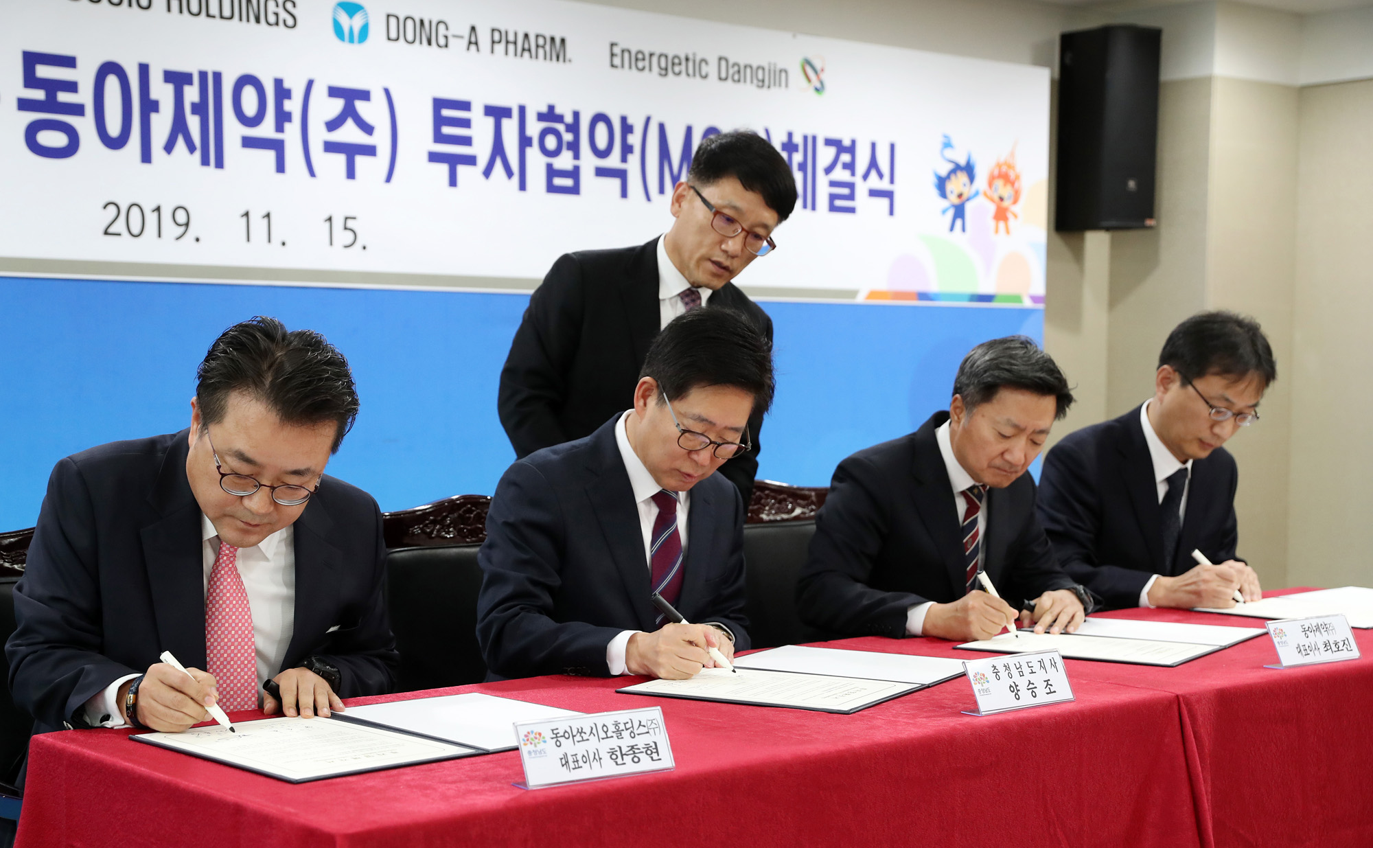 양승조 지사가 15일 도청 상황실에서 한종현 동아쏘시오홀딩스 대표이사, 최호진 동아제약 대표이사, 이건호 당진부시장 등과 투자양해각서(MOU)를 체결했다.