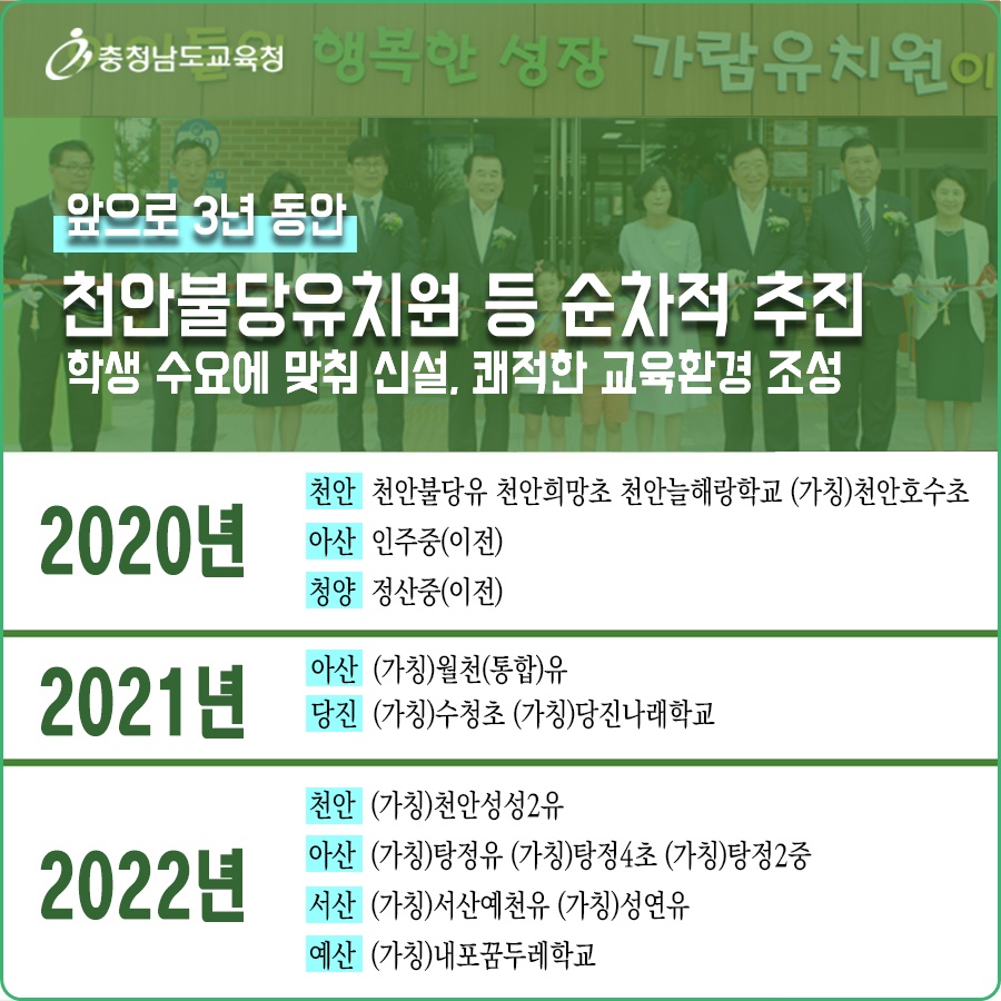 내년 천안에는 천안불당유치원, 천안희망초, 천안늘해랑학교, (가칭)천안호수초 가 설립되며, 아산에서는 인주중학교, 청양에서는 정산중학교가 이전 설립된다.