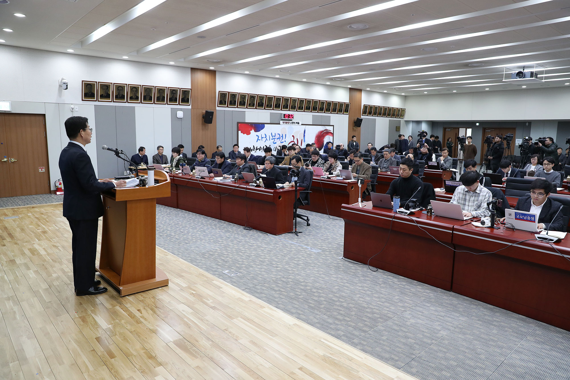 양승조 지사가 18일 도청 대회의실에서 송년 기자회견을 갖고 “내년은 그동안 뿌린 씨앗의 싹들이 꽃을 피우고 열매를 맺도록 박차를 가할 시기이다”며 “저출산·고령화, 사회 양극화의 위기 앞에서 도민 행복과 미래성장 전략 마련에 더욱 힘차게 나서겠다”고 밝혔다.