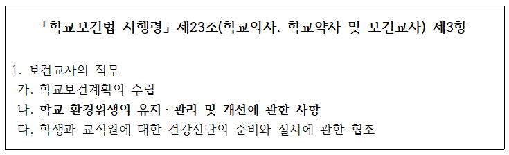 ‘보건교사의 직무로 규정된 “학교환경위생의 유지 관리 및 개선에 관한 사항”을 ‘조언’이라 해석하는 아전인수의 모습‘