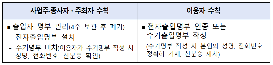 시설 이용자나 행사 참가자는 반드시 전자출입명부로 출입 인증을 하거나 수기출입명부를 작성해야 하며, 전자출입명부의 경우, 이용자는 개인별로 암호화 된 1회용 QR코드를 발급받아 관리자에게 제시해야 한다.