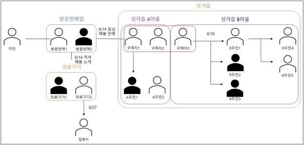 천안 성거읍 마을의 경우 방문판매업에서 시작된 것으로 확인됐다. 4일 0시 기준 도내 코로나19 확진자 374명 중 천안 확진자는 203명으로, 확진자가 폭증한 8월 15일 이후 도내 확진자 172명 중 천안은 88명으로 51%를 차지하고 있으며, 이 가운데 16명은 방문판매 사업장에 방문했거나, 방문자의 접촉자로 드러났다.