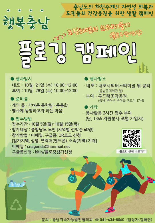 충남지속가능발전협의회는 충남도의 자연성 회복과 도민들의 건강 증진을 위한 사회적인 생활문화 정착을 위한 시범사업으로, 건강을 지키며 자연을 보호하는 ‘행복충남 플로깅 캠페인’을 진행한다고 15일 밝혔다.