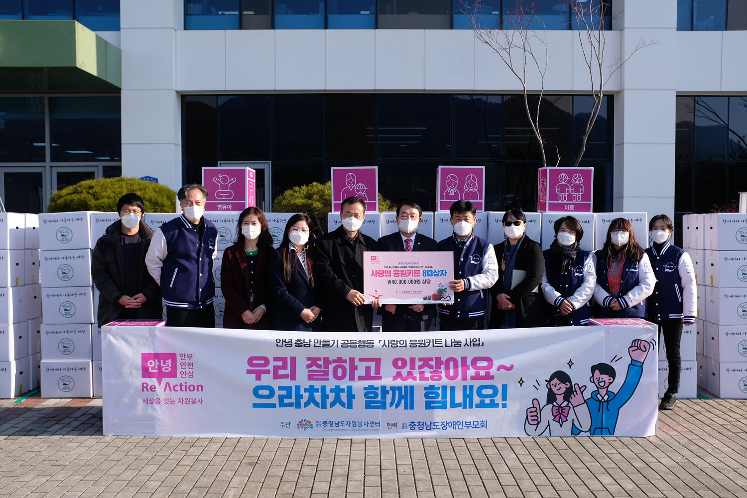응원 키트를 전달받은 전재하 충남장애인부모회 대표는 “장애인 가족에 대한 인식개선과 돌봄 서비스 지원, 생활 환경 개선을 위해 평소 도움의 손길을 펼쳐 주시는 많은 자원봉사자들과 센터 관계자 여러분께 감사하다”고 말했다.