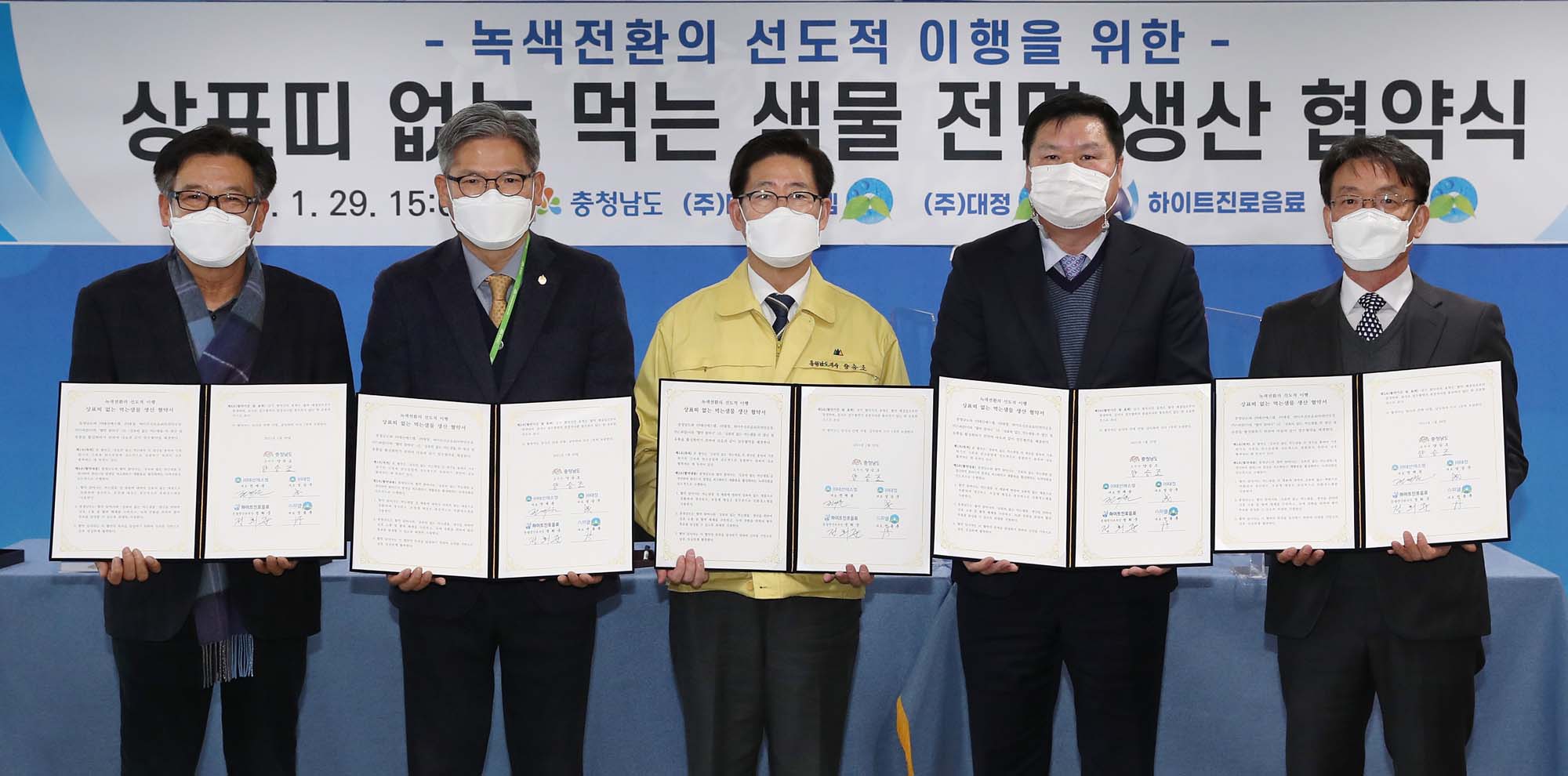 충남도는 29일 대산에스엠, 대정, 하이트진로음료 천안공장, 스파클 등 도내 먹는 샘물 업체 4곳과 ‘상표 띠 없는 먹는 샘물 생산 협약’을 체결했다.