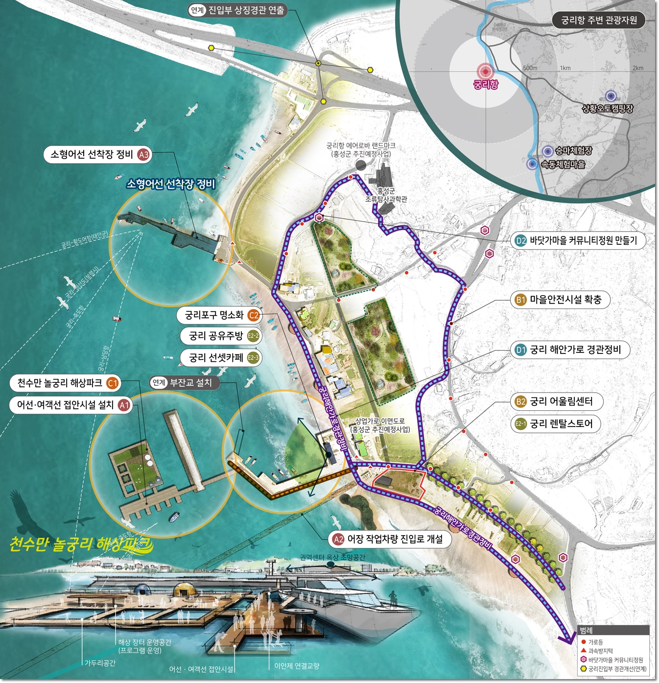 궁리항에 어선과 여객선 접안시설 등 어항 편의시설을 현대화하고, 5,057㎡의 규모의 놀궁리 해상파크와 해변조망명소 등 관광기반 및 가두리 양식장 체험 관광자원을 개발, 지역 주민소득창출기반을 마련한다.
