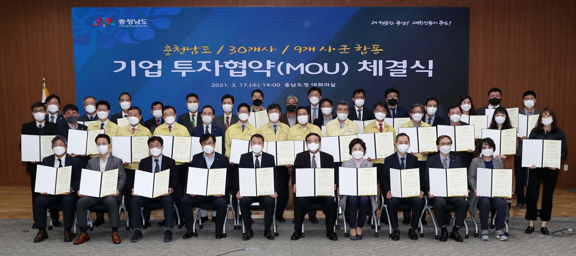 양승조 지사는 이날 협약식에서 “반도체, 바이오, 자동차, 배터리, 디스플레이, 식품, 첨단소재 등 각자의 산업 분야에서 대한민국을 대표하는 우수기업들과 인연을 맺게 됐다”며 “코로나19라는 어려운 여건 속에서도 과감한 결정을 한 각 기업에 힘이 되도록 전심전력을 다할 것이다”고 말했다.