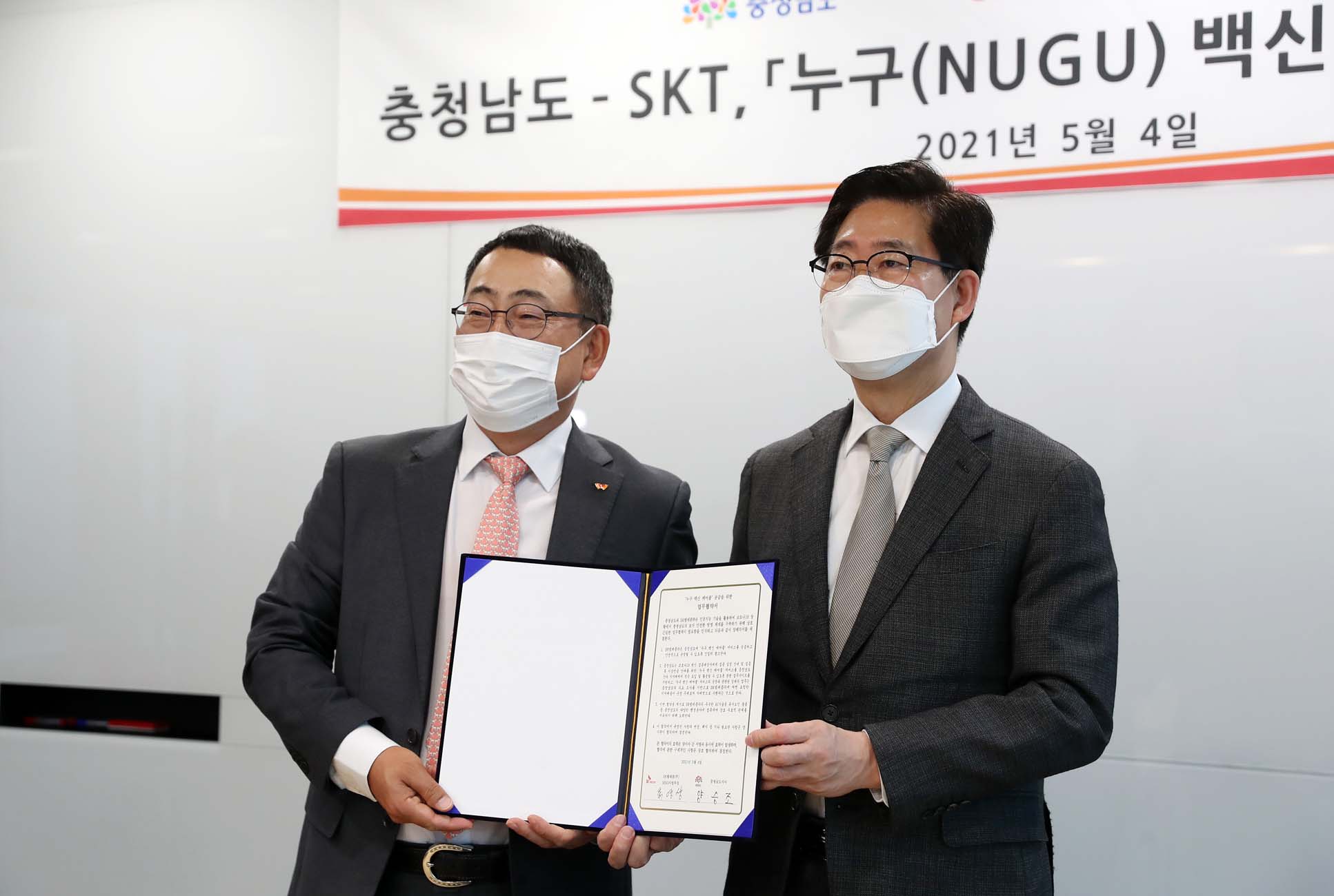 양승조 지사는 4일 서울 SK T-타워에서 유영상 SKT MNO 사업부장과 ‘누구(NUGU) 백신 케어콜’ 공급 업무협약을 체결했다.