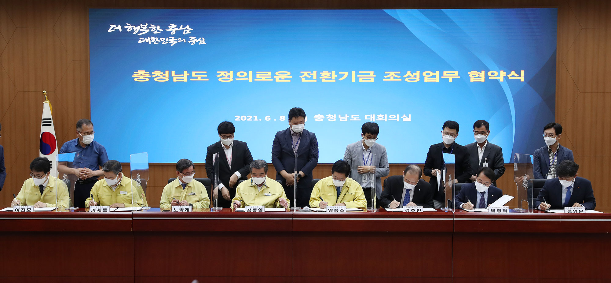 8일 도청 대회의실에서 김동일 보령시장, 노박래 서천군수, 가세로 태안군수, 이건호 당진부시장, 김호빈 한국중부발전 사장, 박형덕 한국서부발전 사장, 김영문 한국동서발전 사장과 ‘석탄화력발전 단계적 폐지 대응을 위한 충청남도 정의로운 전환 기금 조성 업무협약’을 체결했다.