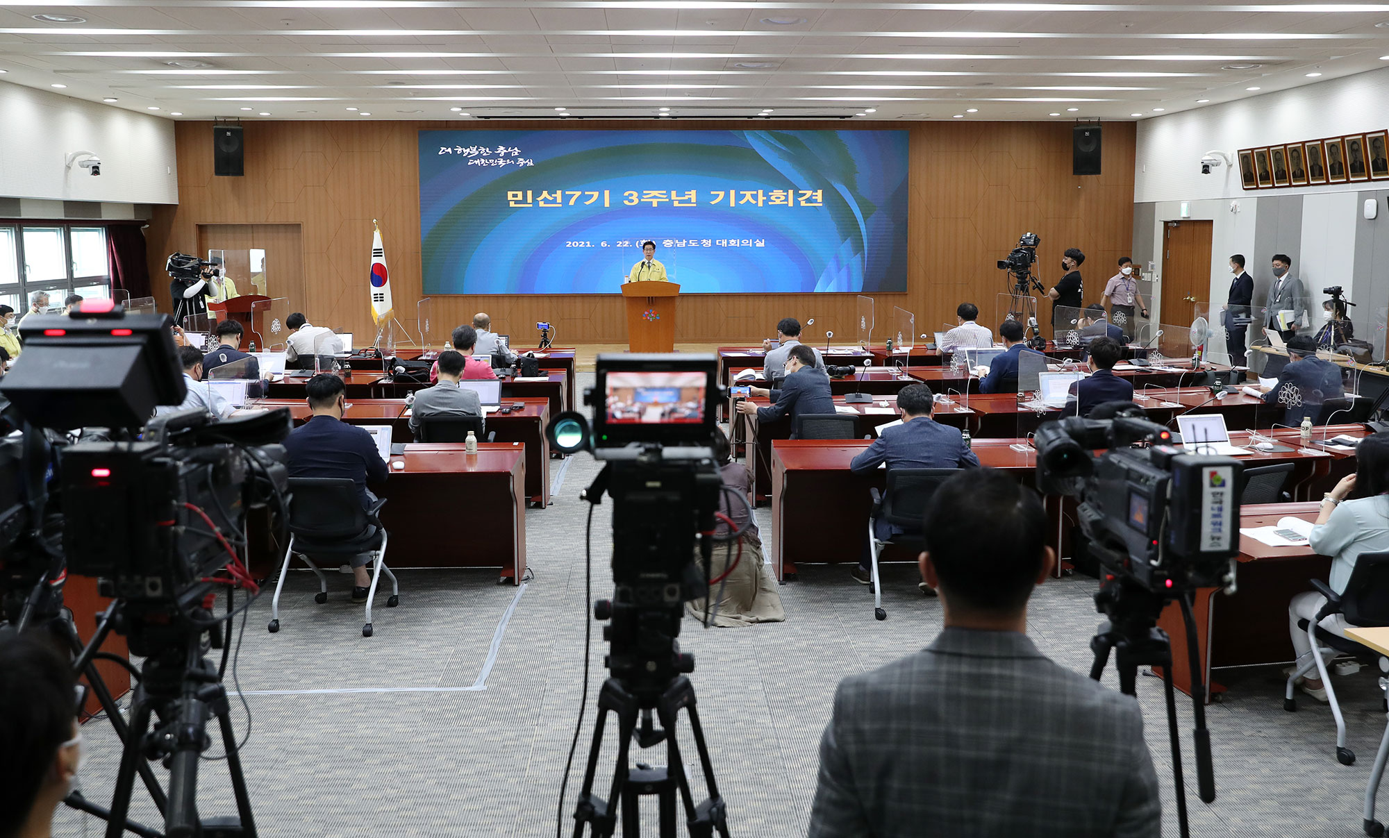 양승조 지사는 22일 도청 대회의실에서 민선7기 3주년 기자회견을 갖고, 지난 3년 동안의 성과와 앞으로의 도정 운영 방향 등을 밝혔다.