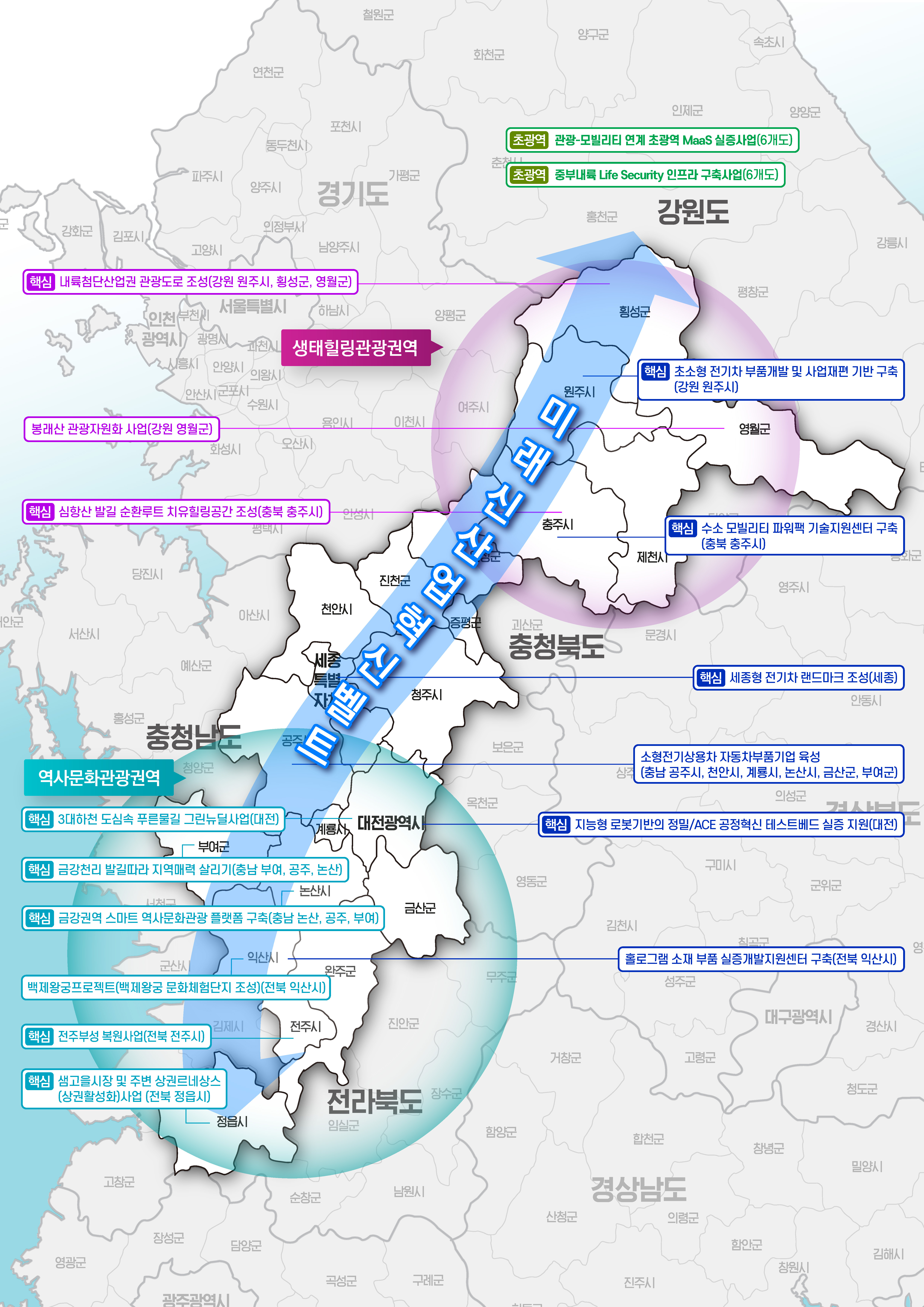 도의 주요 사업은 자율주행자동차 부품 테스트베드 구축, 소‧부‧장 제조혁신파크 거점개발 및 클러스터 구축, 국방산업 클러스터 구축, 바이오소재 국산화허브단지 구축, 농업용 협동로봇 산업육성, 금강천리 발길따라 지역매력 살리기, 금강권역 스마트 역사문화관광 플랫폼 구축, 백마강 국가정원 조성, 내륙권 유교문화 국제관광 산업육성 및 세계화 추진 등 40개 사업이다.