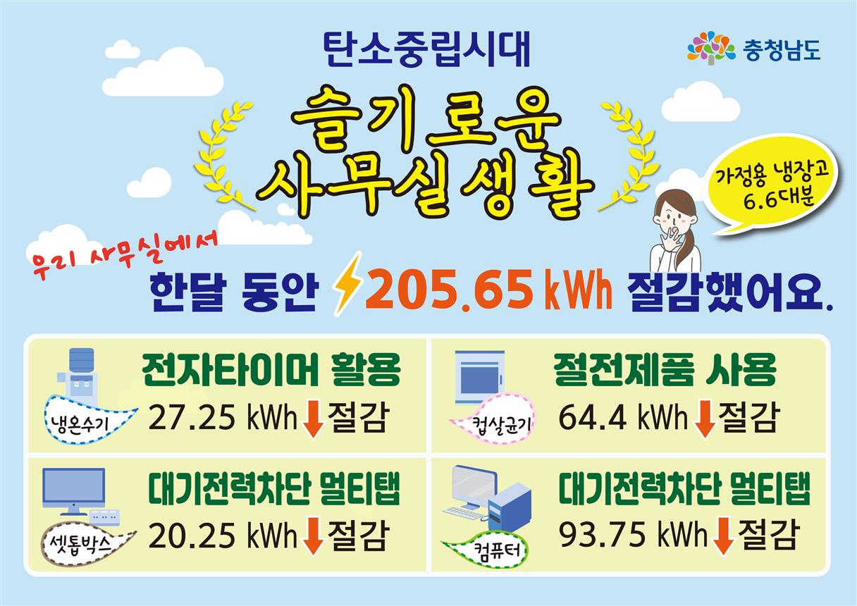 충남도가 범정부 탄소중립 주간(12월 6∼10일)을 맞아 도청 사무실에서 사용 중인 주요 전자제품에 대한 구체적인 에너지 절감 방안을 내놔 눈길을 끌고 있다.