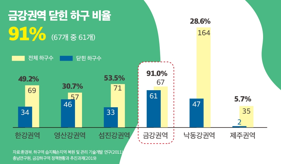 현재 금강권역의 닫힌 하구는 67개 중 61개(91%)로 전국에서 가장 높은 비율이다. 이 중 충남은 34개 중 28개가 닫혀있다.