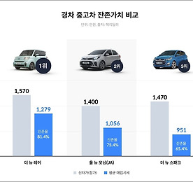 홍주인뉴스] 헤이딜러, 경차 중고차 잔존가치 조사 결과 발표… 더 뉴 레이 1위 1위 더 뉴 레이, 2위 올 뉴 모닝(JA), 3위 더 뉴 스파크 순 최근 5개월간 국산차 7만3034건 온라인 경매 데이터로 산출 온라인 내차팔기 서비스 헤이딜러가 국산 경차 3개 차종의 중고차 잔존가치를 발표했다 24일 헤이딜러가 발표한 신차가 대비 중고차 잔존가치 데이터에 따르면 1위 기아 더 뉴 레이, 2위 기아 올 뉴 모닝(JA), 3위 쉐보레 더 뉴 스파크 순으로 나타났다. 레이는 신차가 대비 81.4%의 잔존가치를 나타냈고, 75%를 나타낸 모닝이 2위, 그 뒤를 이어 스파크가 65.4%를 기록했다. 경차 신차 판매량은 2016년 17만대, 2017년 13만대, 2018년 예상 약 11만대로 3년 연속 줄어들고 ..